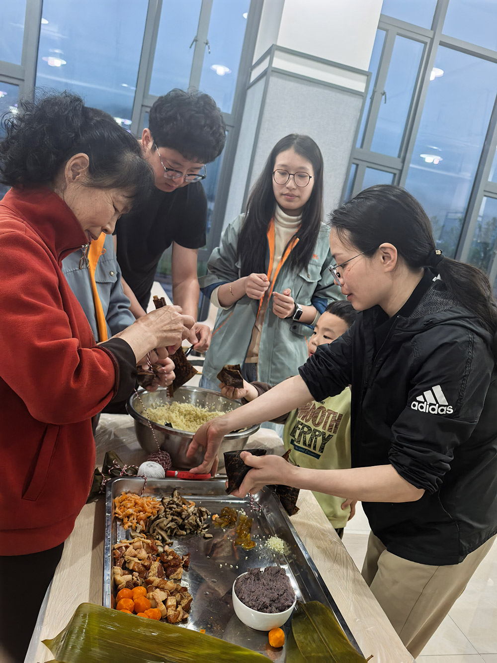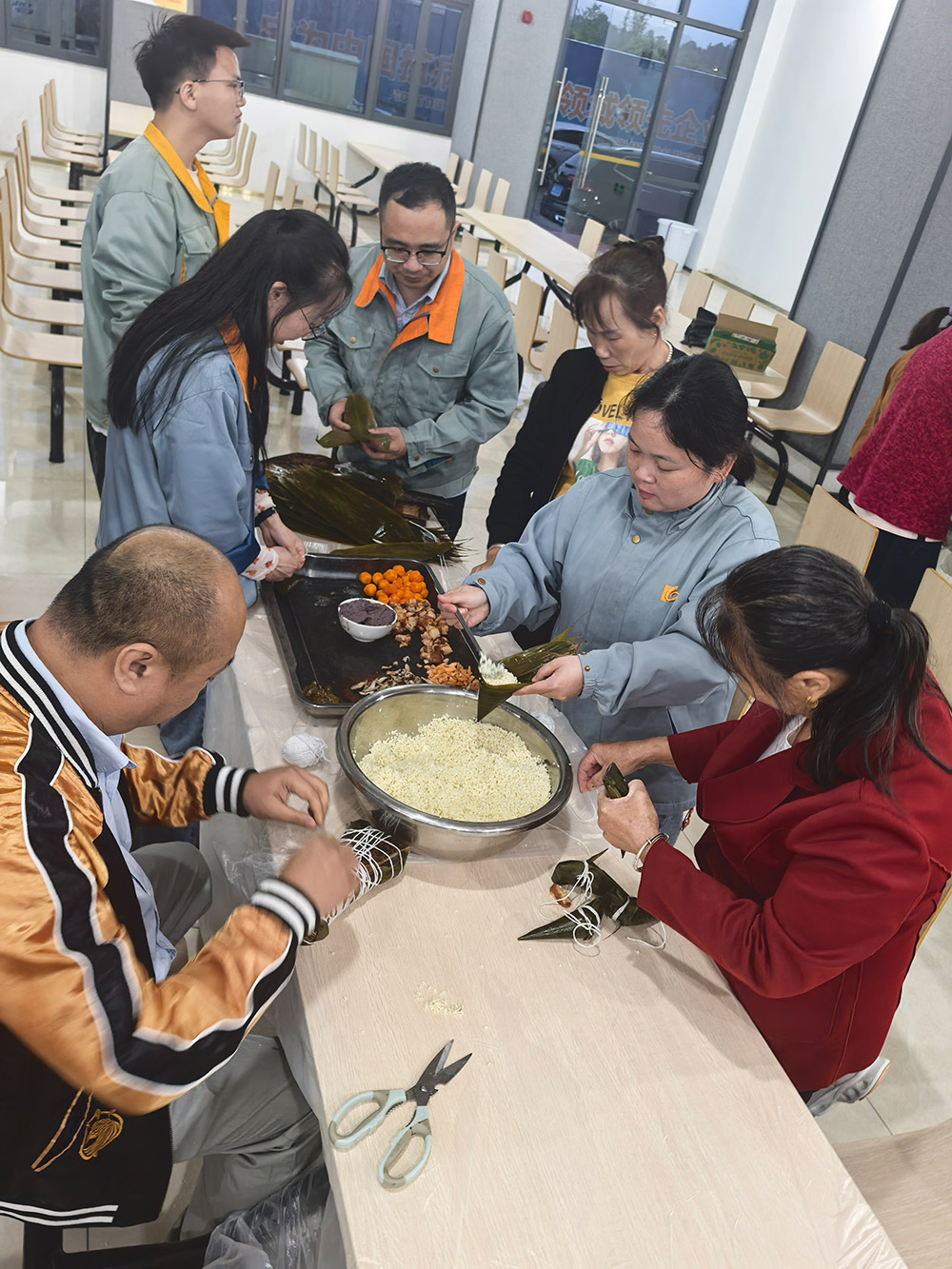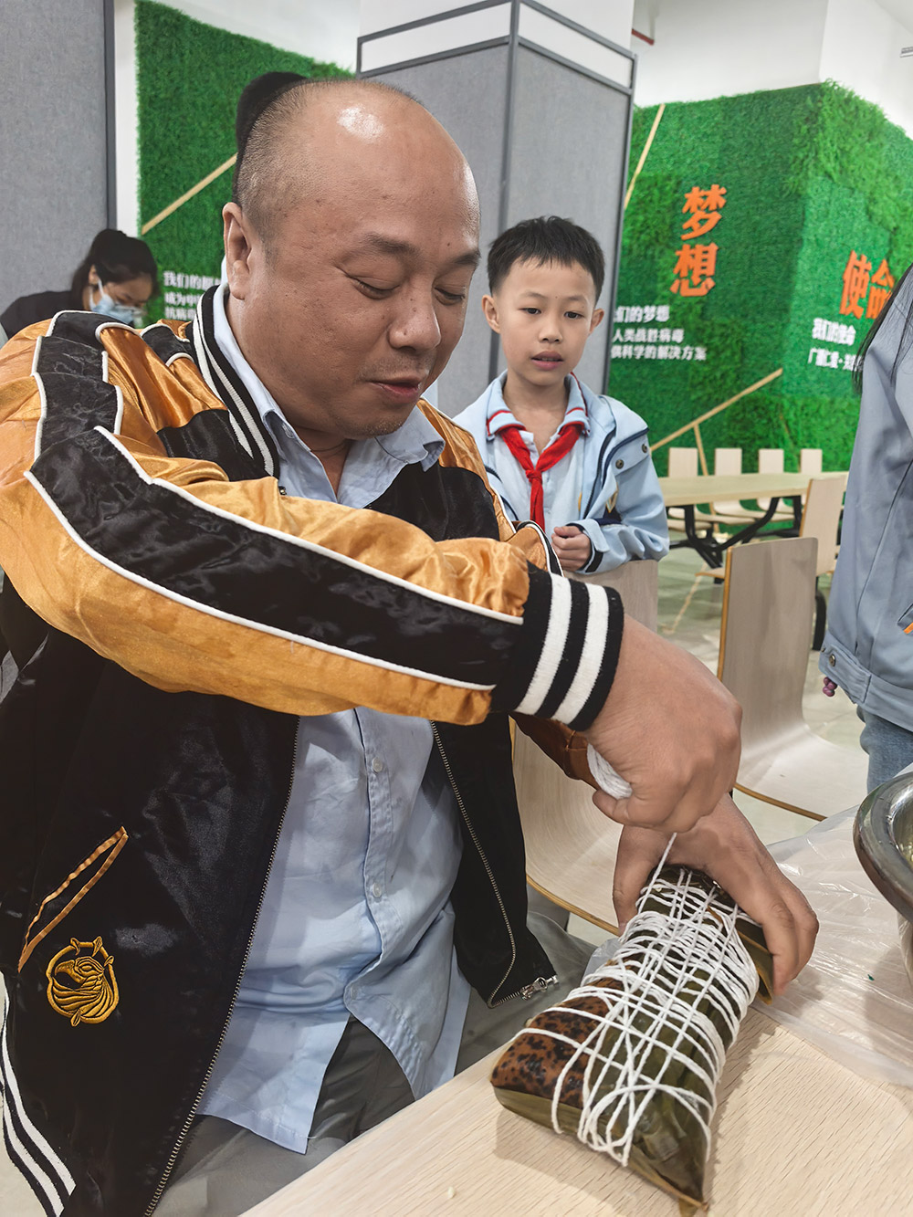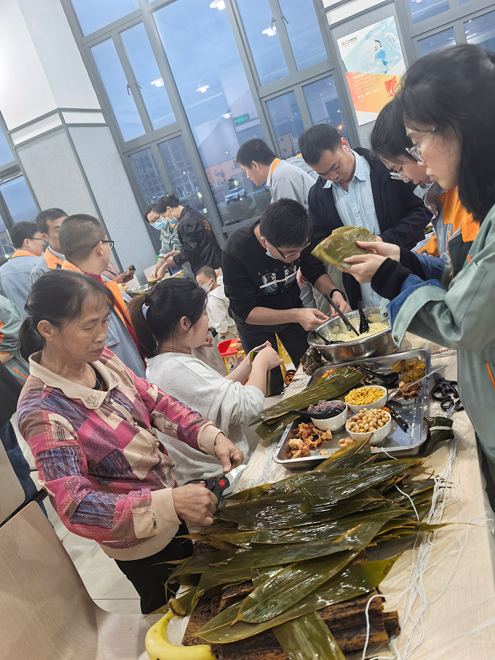 科技中心的歡笑聲回蕩的同時,柘榮生產(chǎn)基地則上演了一場溫馨的“‘粽’香傳情·家企共融”主題活動。來自全國各地的員工與家屬齊聚一堂,將天南地北的習俗融入粽葉之中。粽葉翻飛間,三角粽、四角粽、長條粽形態(tài)各異;豆沙蛋黃、鮮肉陳皮等餡料咸甜交織。大家一邊制作創(chuàng)意滿滿的“全家福”粽子,一邊分享家鄉(xiāng)端午故事,互道節(jié)日祝福,共享佳節(jié)良時。非遺文化體驗與包粽技藝比拼,不但傳承了傳統(tǒng)民俗,更生動詮釋了廣生堂深厚的“家文化”,讓員工家屬深切感受到企業(yè)的關懷。