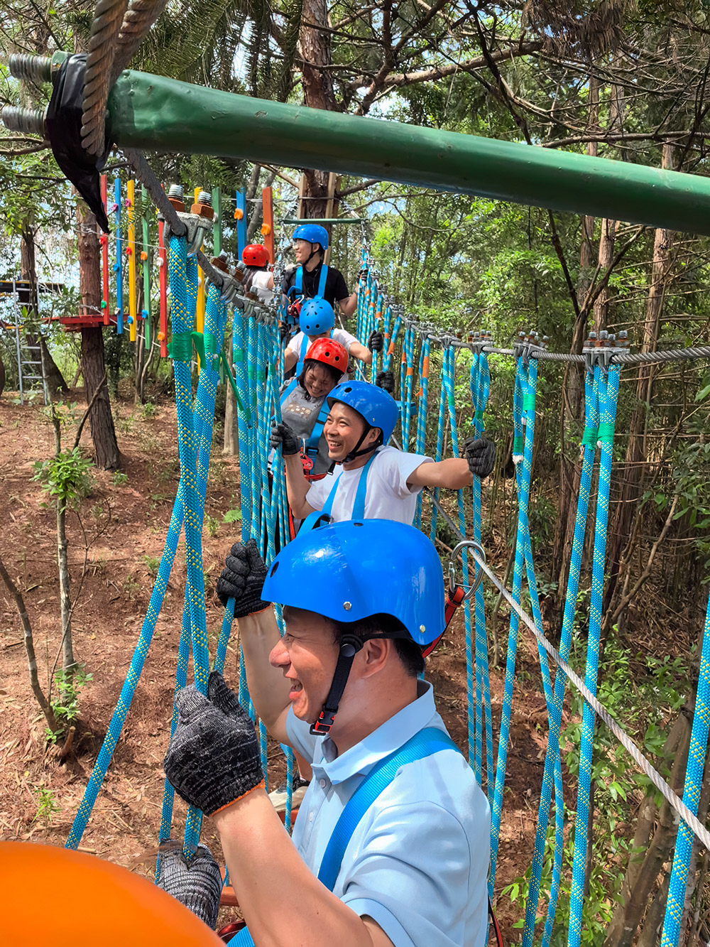 富有挑戰(zhàn)性的拓展項目化身團隊協(xié)作催化劑:叢林穿越挑戰(zhàn)自我,同事們相互扶持共同克服難關;玻璃棧道上俯瞰美景,既驚險又賞心悅目,大家互相鼓勵勇敢前行,享受視覺盛宴。保險纜串聯(lián)起信任紐帶,同事的鼓勵使顫抖的腳步變得堅定。這場“自然課堂”生動詮釋了金塘人的團隊精神:既能共攀事業(yè)高峰,亦能笑對各種挑戰(zhàn)。